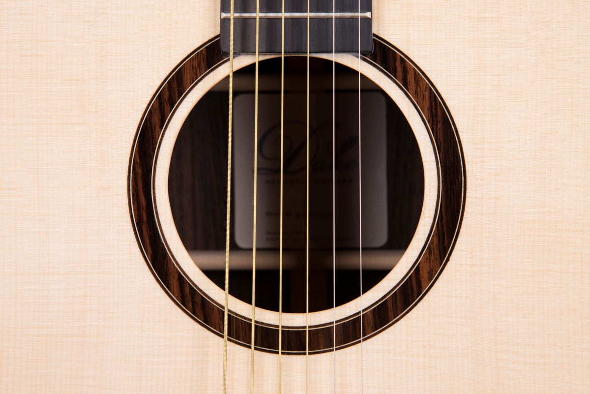 Dit D-PF cut satin model heeft een Zwitsers sparren top en gelaagd palissander voor de zij- en achterkanten.