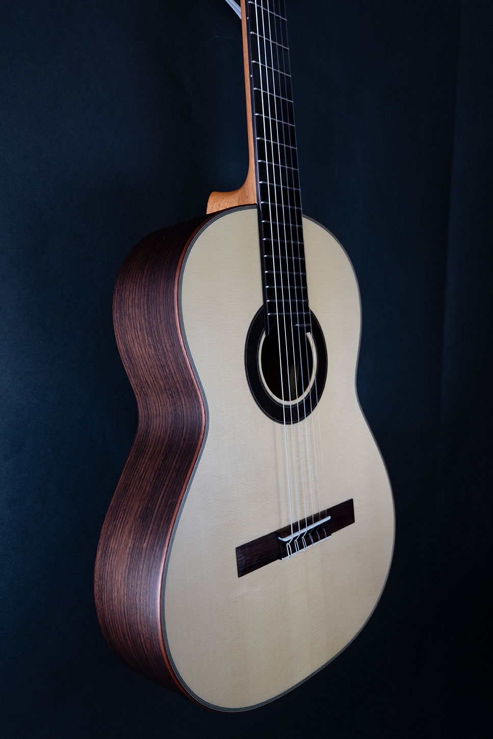Gemaakt van massief toonhout, wordt deze gitaar geleverd met hoogwaardige Teflon-gemonteerde 'Rubner Gold stemmechanieken' en gebuste gaten. Andere kwaliteitskenmerken zijn de cedro-hals die overal is gelamineerd met hardhout, het Afrikaanse blackwood-toetsbord en de brugkam van hard botmateriaal. De asymmetrische HANIKA-fanbracing in sparrenhout is hier verantwoordelijk voor het beste geluid en de beste stabiliteit.
