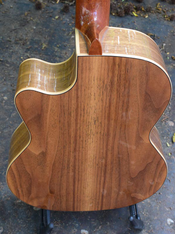 Met massief sparrenhouten bovenblad, Afrikaans mahonie hals. Voor de zij- en achterkant is gelamineerd walnoothout gebruikt.