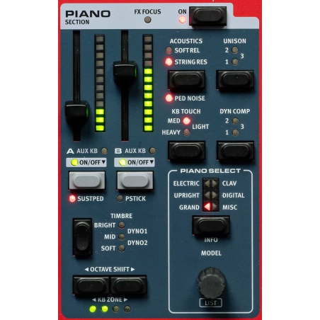 De orgelsectie bevat onze bekroonde simulaties van B3 Tonewheel, B3 Bass, klassieke Vox en Farfisa, evenals twee pijporgelmodellen. Alle Stage 4 modellen zijn uitgerust met de nieuwe Nord Physical dissels met LED-indicatoren voor optimale hands-on ervaring en overzicht.