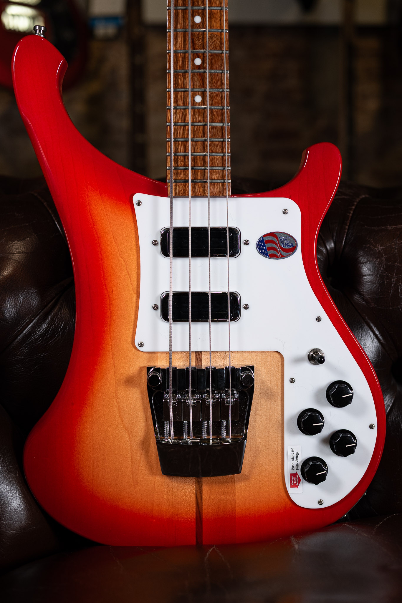 “Fireglo” is een typische Rickenbacker-kleur: rood/oranje over maple. Het is een van de meest klassieke en herkenbare finish van het merk.