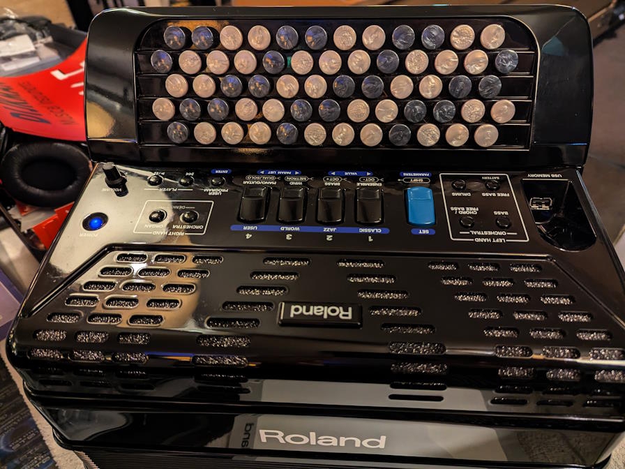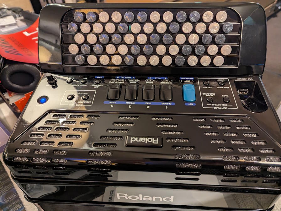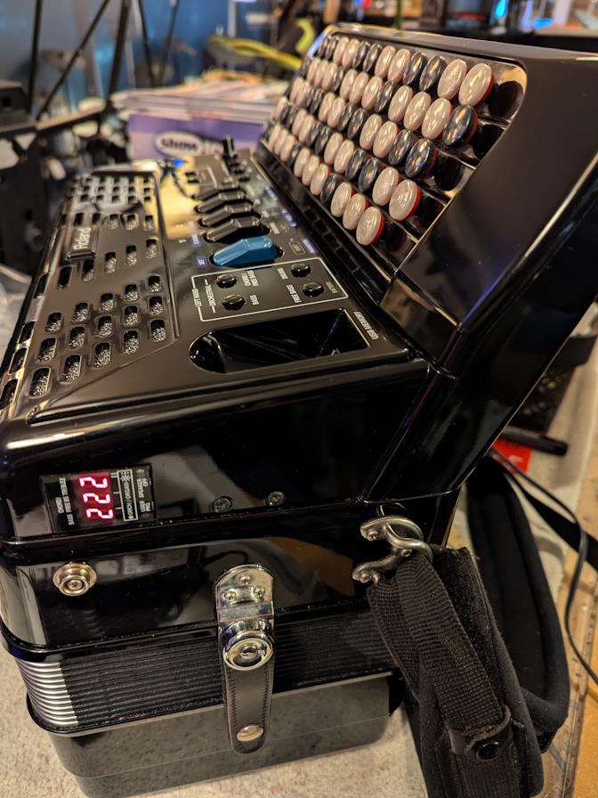 72 basknoppen, aanslaggevoelig hoge resolutie druksensor: pneumatische detectie van druk in de balg weerstand van de balg instelbaar treble-voetmaten: 7 bass-voetmaten: 5 akkoord voetmaten: 3 free bass-voetmaten: 2 voorgeprogrammeerde microstemmingen: 16 (Off, Dry, Classic, F-Folk, American L/H, North Europe, German L/H, DFolk L/H, Alpine, Italian L/H, French, Scottish) effecten: Reverb (8x), Chorus (8x), Rotary (Slow/Fast) voor orgelklanken knoppen en schakelaars: Volume, 4 x Treble/Orchestra/Organ register, SET register, Drum On/Off, Orchestra On/Off, Organ On/Off, Free Bass On/Off, Orchestra Bass On/Off, Orchestra Chord/Free Bass On/Off, User Programs On/Off, Wave/MP3 player: Reset/Stop, Play/Pause, Power bass- en akkoord modi: 2 Bs Rows, 3 Bs Rows A-7th, 3 Bs Rows A-5dim, 3 Bs Rows B-7th, 3 Bs Rows B-5dim, 3 Bs Rows Bx-7th, 3 Bs Rows Belgium free bass modi: Minor 3rd (37 notes Eb – Eb), Bajan (37 notes D – D), Fifth (36 notes C – C), North Europe (37 notes D – C#) , Finnish (37 notes D – D) orchestra / organ modi: Solo, Dual User Program geheugens: 8 LED-scherm: 3 x 7 segmenten uitgangsvermogen: 2 x 7 W RMS luidsprekers: 2 x 9 cm voeding: AC-adapter of 8x AA-batterijen operationeel op batterijen: ca. 5 uur (luidsprekersysteem uitgeschakeld ca. 8 uur) master-uitgang L / Mono (treble), R / mono (bass): 6.35mm jack hoofdtelefoonuitgang: 6.35mm stereo-jack USB-B poort (computer, MIDI) USB-A poort (data-opslag, audio-player) MIDI uit: DIN-5 afmetingen 405 x 365 x 195 mm gewicht (zonder batterijen): 6.5 kg klanken: accordeon sets: 16 (waarvan 4x user) elke accordeonset is voorzien van: 14 Treble registers 7 basregisters 7 Free Bass registers 7 Orchestra Bass registers 7 Orchestra Chord registers 7 Orchestra Free Bass registers meegeleverde accessoires: AC adapter handleiding draagriemen band voor het veiligstellen van de adapter, MIDI en/of geluidskabels